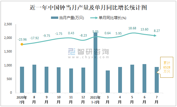 根據國家統計局數據顯示:2021年7月中國鐘產量為946萬只,同比增長8.27%;2021年1-7月中國鐘累計產量為6528萬只,同比增長9.22%;2015-2020年中國鐘產量2016年達到最高,此后總體呈現下降趨勢。