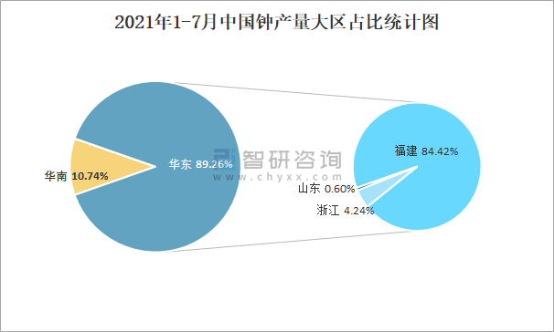 2021年1-7月中國鐘產量大區占比統計圖