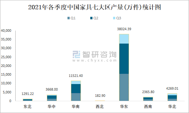2021年1-7月中國家具產量為61322.7萬件 華東地區產量最高(占比62.01%)