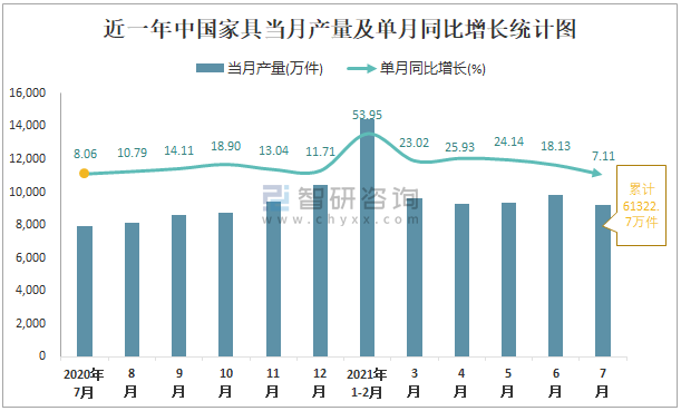 根據國家統計局數據顯示:2021年7月中國家具產量為9247萬件,同比增長7.11%;2021年1-7月中國家具累計產量為61322.7萬件,同比增長25.67%;2015-2020年中國家具產量2018年跌至最低,此后逐年遞增。