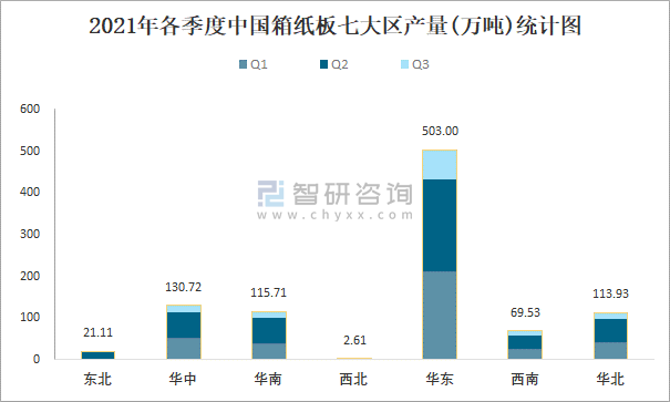 2021年各季度中國箱紙板七大區產量統計圖