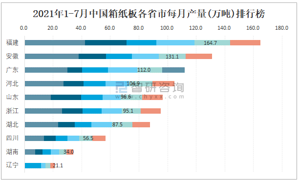 2021年1-7月中國箱紙板各省市每月產量排行榜