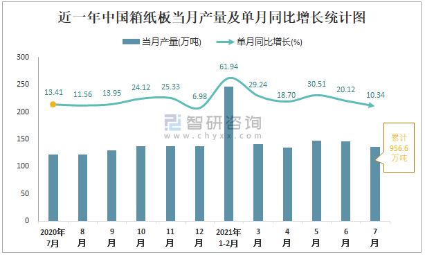 根據國家統計局數據顯示:2021年7月中國箱紙板產量為136萬噸,同比增長10.34%;2021年1-7月中國箱紙板累計產量為956.6萬噸,同比增長30.56%;2015-2020年中國箱紙板產量總體呈現上升趨勢,2020年達到最大。