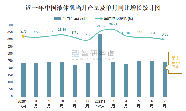 根據國家統計局數據顯示:2021年7月中國液體乳產量為240萬噸,同比增長0.31%;2021年1-7月中國液體乳累計產量為1636.5萬噸,同比增長14.61%;2015-2020年中國液體乳產量2018年跌至最低,此后逐年遞增。