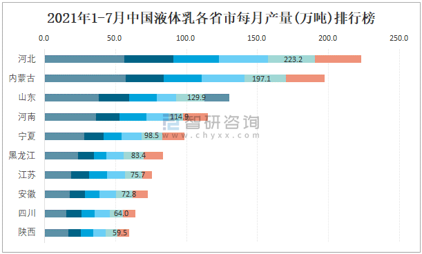 根據國家統計局數據顯示:2021年各季度(第三季度暫只統計7月數據)中國液體乳主要集中在華北、華東、西北地區生產;2021年1-7月中國液體乳產量大區分布相對均衡,其中華北地區產量最高,特別是河北省貢獻了最多產量;2021年1-7月中國液體乳各省產量呈現梯隊式分布,河北、內蒙古兩省產量最多。