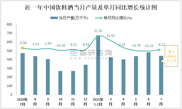 根據(jù)國家統(tǒng)計局數(shù)據(jù)顯示:2021年7月中國飲料酒產(chǎn)量為444萬千升,同比下降6.12%;2021年1-7月中國飲料酒累計產(chǎn)量為2864.3萬千升,同比增長7.92%;2015-2020年中國飲料酒產(chǎn)量逐年遞減,2020年達到最低。