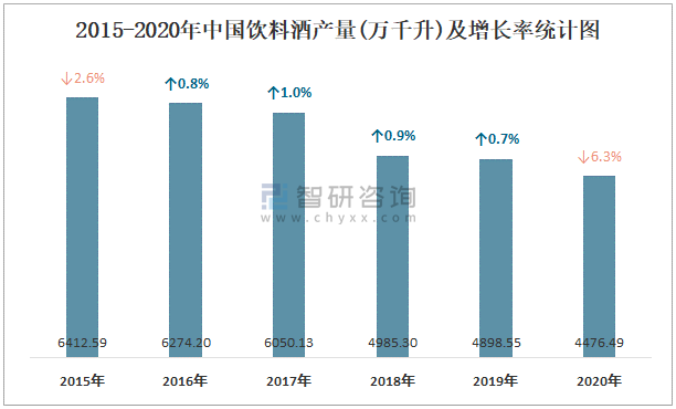 2015-2020年中國飲料酒產(chǎn)量及增長率統(tǒng)計圖