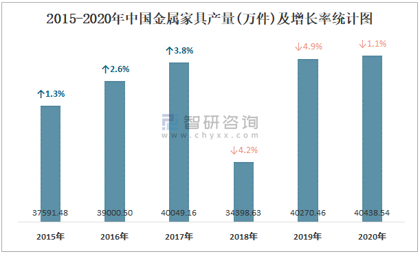 根據國家統計局數據顯示:2021年7月中國金屬家具產量為3935萬件,同比增長8.83%;2021年1-7月中國金屬家具累計產量為27879.4萬件,同比增長23.98%;2015-2020年中國金屬家具產量2018年跌至最低值,此后呈現遞增趨勢。