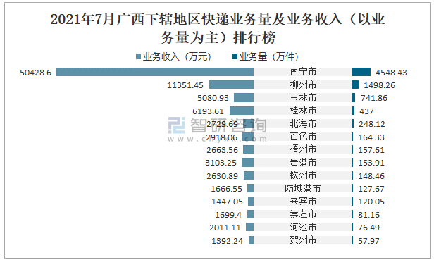2021年7月廣西下轄地區(qū)快遞業(yè)務(wù)量及業(yè)務(wù)收入(以業(yè)務(wù)量為主)排行榜