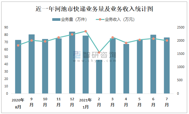 近一年河池市快遞業(yè)務(wù)量及業(yè)務(wù)收入統(tǒng)計圖