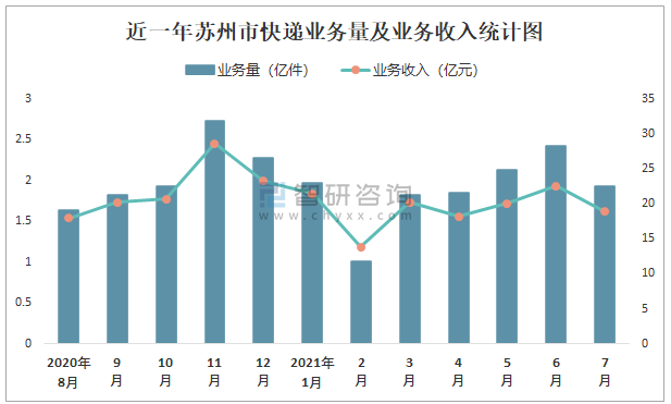 近一年蘇州市快遞業(yè)務量及業(yè)務收入統(tǒng)計圖