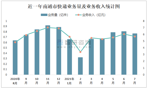 根據各省市郵政局數據可知:2021年7月南通市快遞業務量為7681.6萬件,業務收入為57300.20萬元;2021年1-7月南通市快遞累計業務量為46940.6萬件,同比增長36.8%,累計業務收入為372979.1萬元,同比增長26.1%;2016-2020年南通市快遞業務量與業務收入均逐年遞增,平均單價總體呈現下降趨勢。