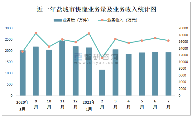 近一年鹽城市快遞業(yè)務(wù)量及業(yè)務(wù)收入統(tǒng)計圖