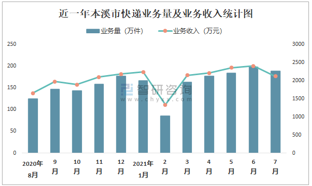 近一年本溪市快遞業(yè)務(wù)量及業(yè)務(wù)收入統(tǒng)計(jì)圖