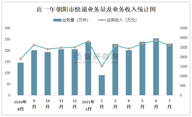 2018-2020年朝陽市快遞業務量及業務收入統計圖