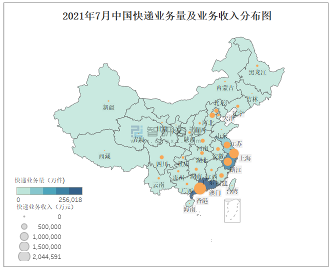 2021年7月中國快遞業務量及業務收入分布圖