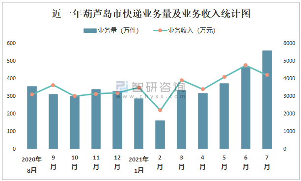 近一年葫蘆島市快遞業務量及業務收入統計圖
