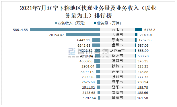 2021年7月遼寧下轄地區快遞業務量及業務收入(以業務量為主)排行榜
