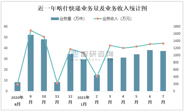 根據(jù)各省市郵政局?jǐn)?shù)據(jù)可知:2021年7月喀什快遞業(yè)務(wù)量為37.34萬件,業(yè)務(wù)收入為1336.85萬元;2021年1-7月喀什快遞累計(jì)業(yè)務(wù)量為215.5萬件,同比增長1.45%,累計(jì)業(yè)務(wù)收入為7864.9萬元,同比增長18.15%。
