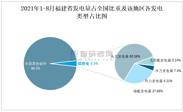 2021年1-8月福建省發電量占全國比重及該地區各發電類型占比圖