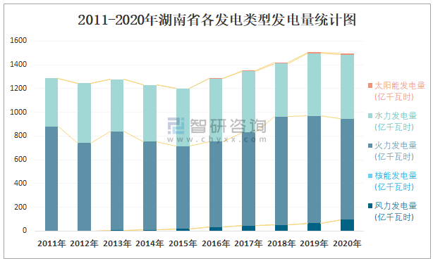 2011-2020年湖南省各發(fā)電類型發(fā)電量統(tǒng)計圖