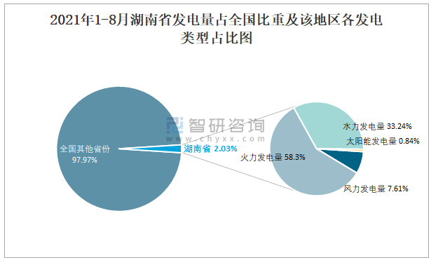 2021年1-8月湖南省發(fā)電量占全國比重及該地區(qū)各發(fā)電類型占比圖