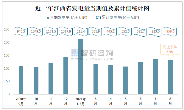 根據國家統計局數據統計可知:2021年8月江西省發電量為131.6億千瓦時,同比下降8.9%,2021年1-8月江西省發電量為959.6億千瓦時,累計增長12.5%;2021年1-8月江西省主要有4種類型發電量,發電量占全國比重約為1.78%,其中火力發電量為832.6億千瓦時,占江西省發電量比重約為86.77%,占全國發電量比重約為1.54%,是江西省最大發電量類型,目前江西省暫無核能發電量。