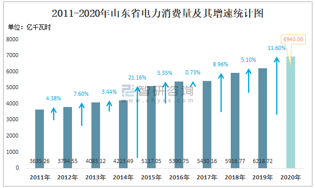 2011-2020年山東省電力消費量及其增速統計圖