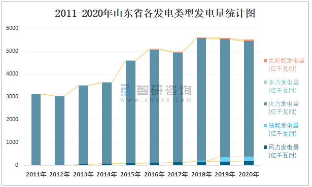 2011-2020年山東省各發電類型發電量統計圖