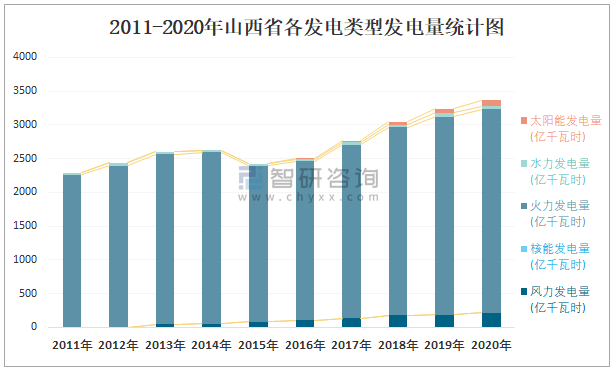 2011-2020年山西省各發(fā)電類型發(fā)電量統(tǒng)計(jì)圖