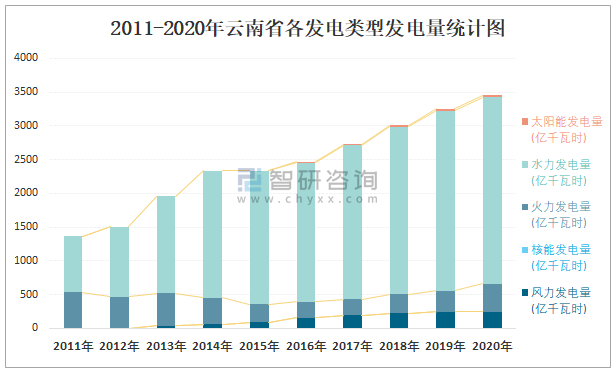 2011-2020年云南省各發電類型發電量統計圖