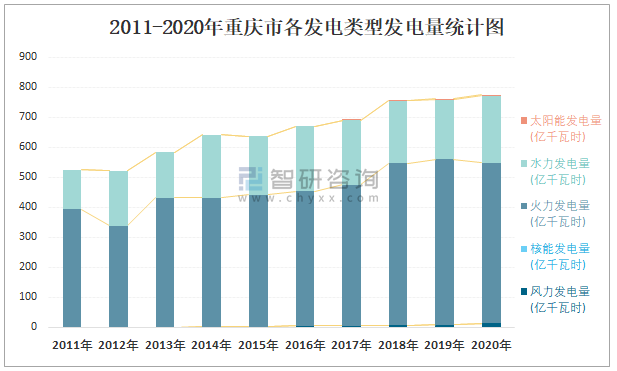 2011-2020年重慶市各發電類型發電量統計圖