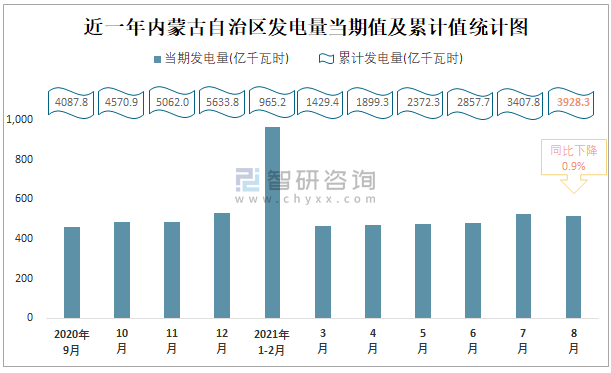 近一年內蒙古自治區發電量當期值及累計值統計圖