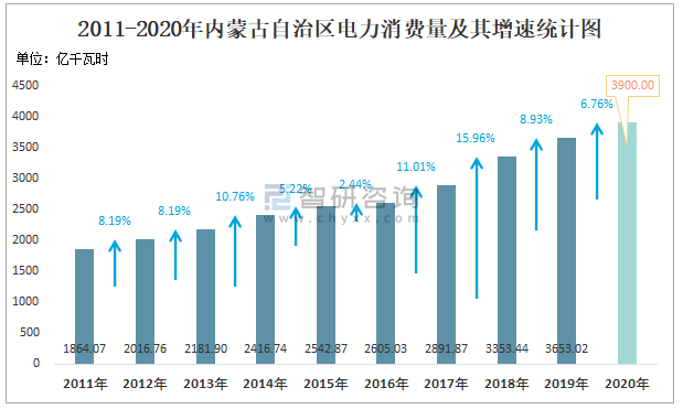 2011-2020年內蒙古自治區電力消費量及其增速統計圖
