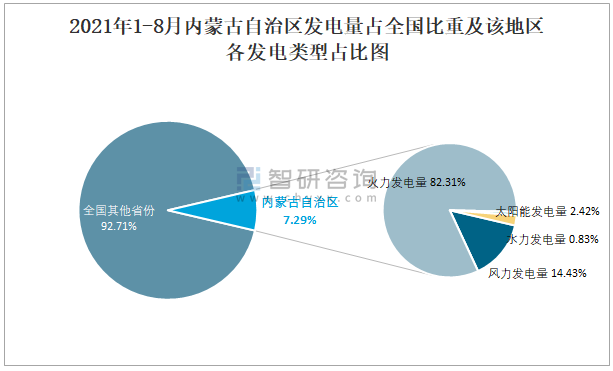 2021年1-8月內蒙古自治區發電量占全國比重及該地區各發電類型占比圖