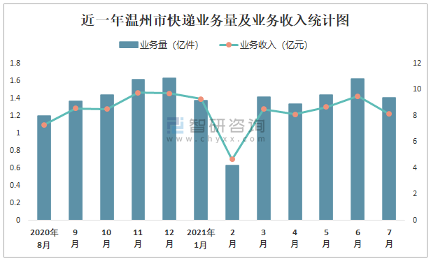 2021年7月溫州市快遞業務量與業務收入分別為14070.3萬件和81324.1萬元