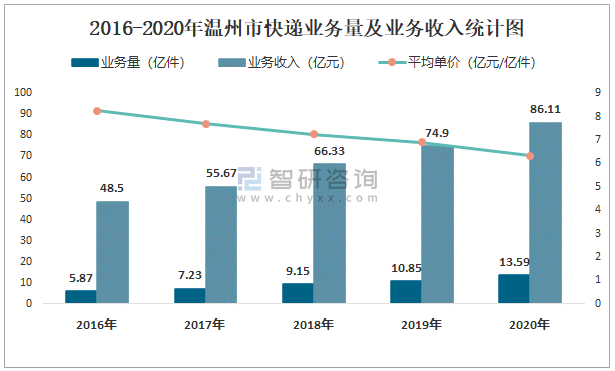 2016-2020年溫州市快遞業務量及業務收入統計圖