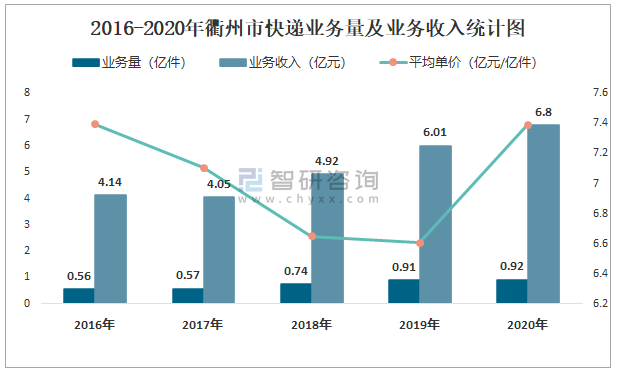 2016-2020年衢州市快遞業務量及業務收入統計圖