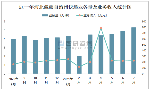 近一年海北藏族自治州快遞業(yè)務(wù)量及業(yè)務(wù)收入統(tǒng)計圖