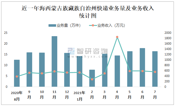 2021年7月海西蒙古族藏族自治州快遞業(yè)務(wù)量與業(yè)務(wù)收入分別為16.4萬件和556.74萬元