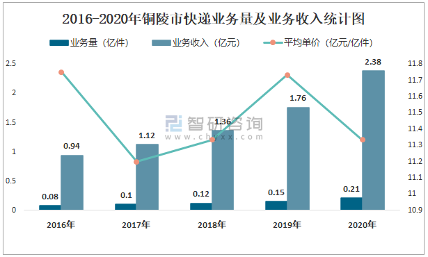 2016-2020年銅陵市快遞業(yè)務(wù)量及業(yè)務(wù)收入統(tǒng)計(jì)圖
