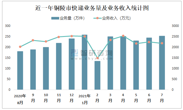 近一年銅陵市快遞業(yè)務(wù)量及業(yè)務(wù)收入統(tǒng)計(jì)圖