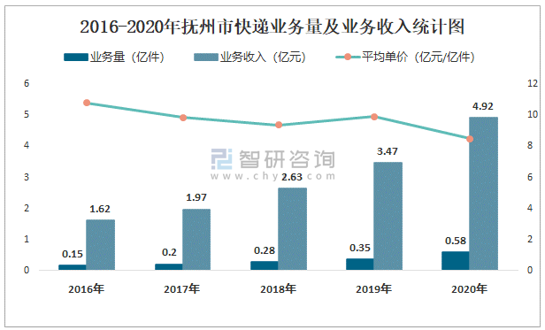 2016-2020年撫州市快遞業務量及業務收入統計圖