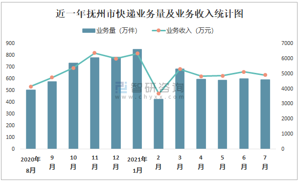 根據各省市郵政局數據可知:2021年7月撫州市快遞業務量為589.84萬件,業務收入為4923.21萬元;2021年1-7月撫州市快遞累計業務量為4330.7萬件,同比增長79.21%,累計業務收入為35114.82萬元,同比增長55.85%;2016-2020年撫州市快遞業務量與業務收入均逐年遞增,平均單價總體呈現下降趨勢。