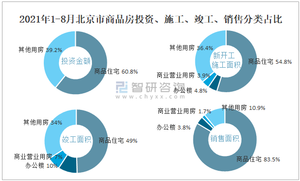 2021年1-8月北京市商品房投資、施工、竣工、銷售分類占比
