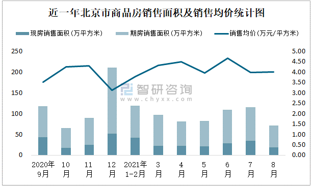 2021年8月北京市銷售商品房71.24萬平方米 銷售均價約為4萬元/平方米