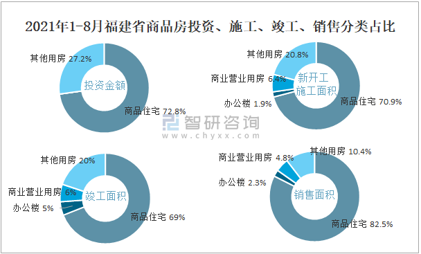 2021年1-8月福建省商品房投資、施工、竣工、銷售分類占比