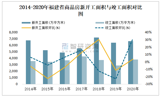 2014-2020年福建省商品房新開工面積與竣工面積對比圖
