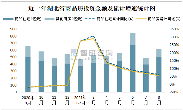 根據國家統計局數據統計可知:2021年8月湖北省房地產開發投資商品房投資金額為618.06億元(其中商品住宅為498.39億元,辦公樓、商業營業用房等其他用房119.67億元);2021年1-8月湖北省房地產開發投資商品房累計投資金額為4049.08億元,投資金額累計同比增長55.6%。