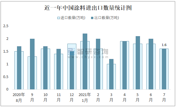 近一年中國涂料進出口數(shù)量統(tǒng)計圖
